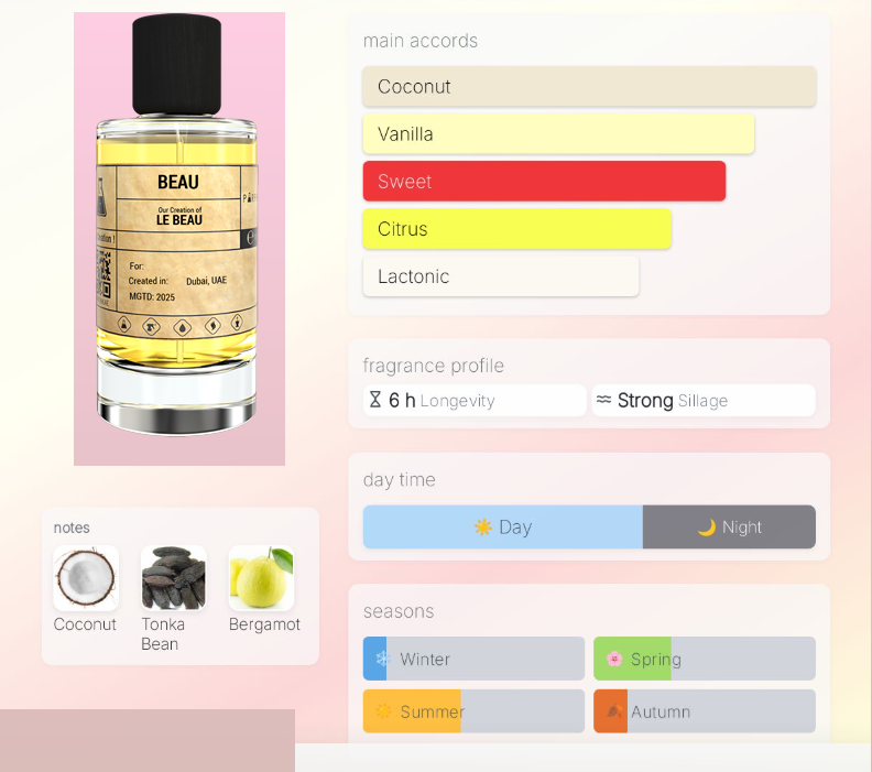 Naš BEAU sadrži 35% parfemskog ulja, što garantira izvanrednu postojanost i intenzitet – dovoljno je par kapljica i vaš mirisni potpis prati vas cijeli dan i noć. Svaka bočica izrađena je s pažnjom i posvećenošću, u skladu s tradicijom arapskih majstora parfumera, čineći ovaj parfem pravim luksuzom koji si sada može svatko priuštiti.