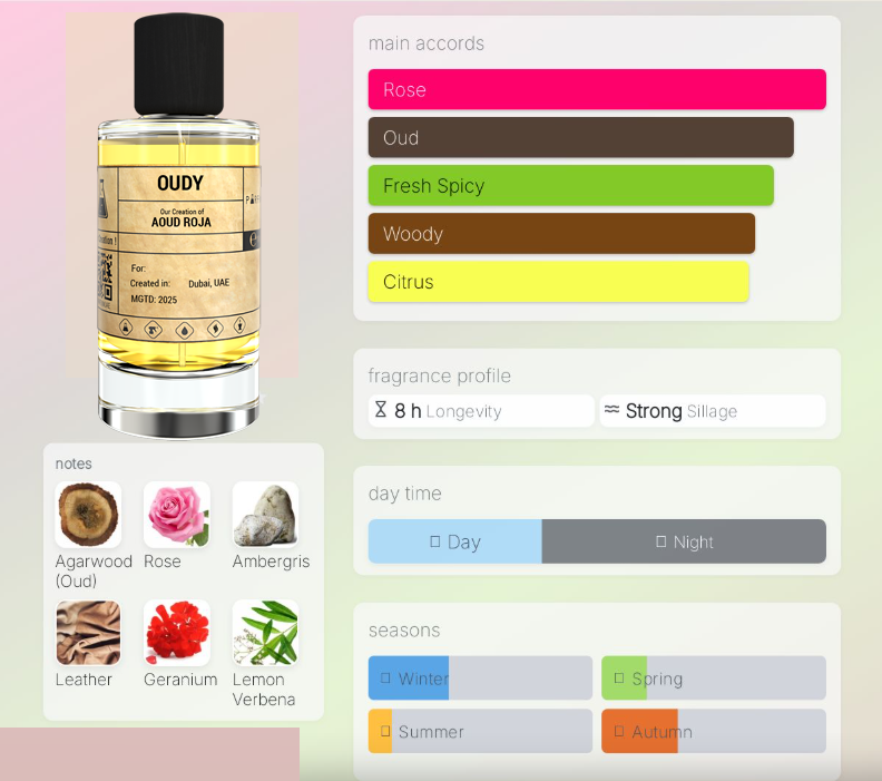 Od prvog trenutka kada se nanese na kožu, OUDY otvara se snažnim i opojnim akordima egzotičnog ouda. Njegova intenzivna i tamna priroda obogaćena je začinskim naglascima i dragocjenim drvenim notama, stvarajući dojam raskošnog orijentalnog ambijenta. Kako se miris razvija, prepliću se toplina začina, bogatstvo smola i nježne cvjetne nijanse, dajući mu kompleksnost i sofisticiranost.