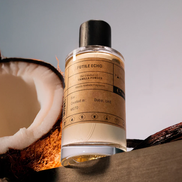 Soft. Addictive. Intimate. FUTILE ECHO is a whisper of warmth — a delicate, powdery vanilla that feels like a comforting embrace on the skin. Handcrafted in Dubai with 35% perfume oil concentration, this elegant creation is inspired by Vanilla Powder by Matière Première, blending pure vanilla with soft musk and airy floral tones for a scent that is both sensual and serene.