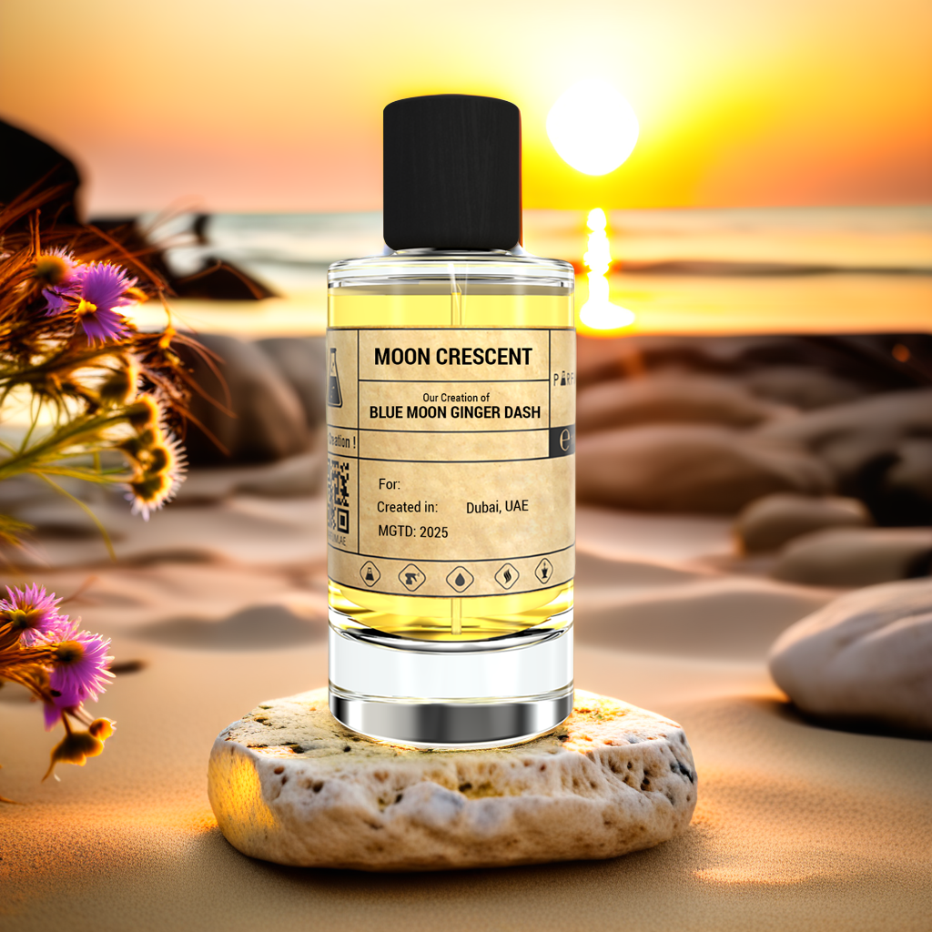 MOON CRESCENT captures the electric charm of a night illuminated by moonlight — a vibrant, citrus-aromatic fragrance inspired by Blue Moon Ginger Dash by Kilian, handcrafted in Dubai by Arabian master perfumers.